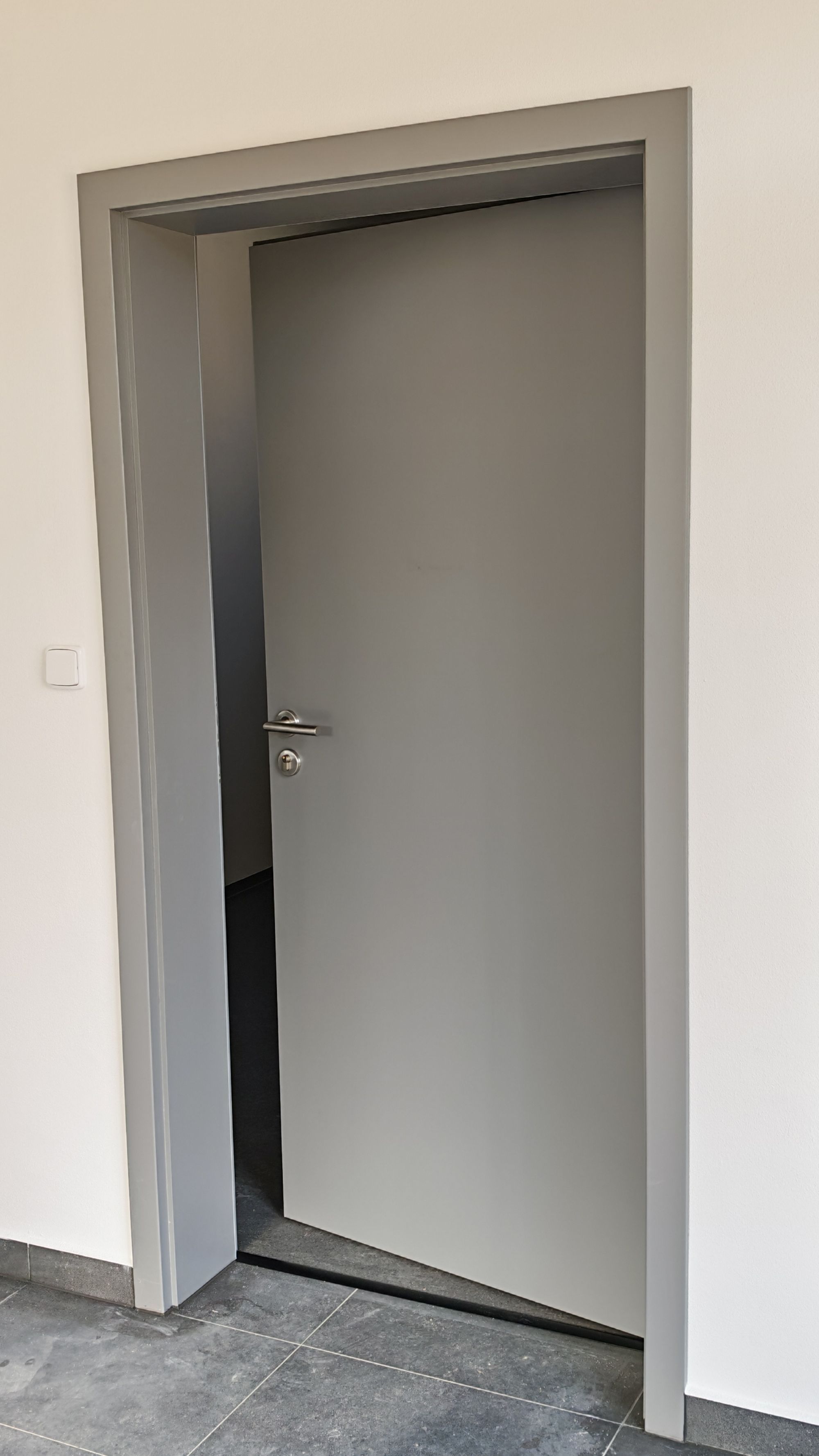 Zárubně: obložkové, falcové, napojení na pokos, šedé těsnění